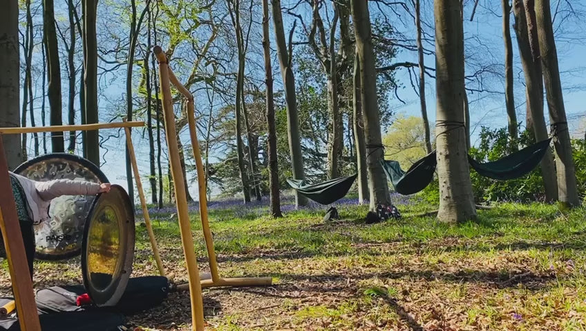 Enter 'wood time' and let the natural surroundings deepen your sound healing journey. The combination of therapeutic gong frequencies and the calming presence of the forest creates a profoundly grounding experience. Whether bathed in dappled sunlight or rain, this session offers complete immersion in nature and sound. You can wear wet weather gear and climb into the hammocks if rain happens.